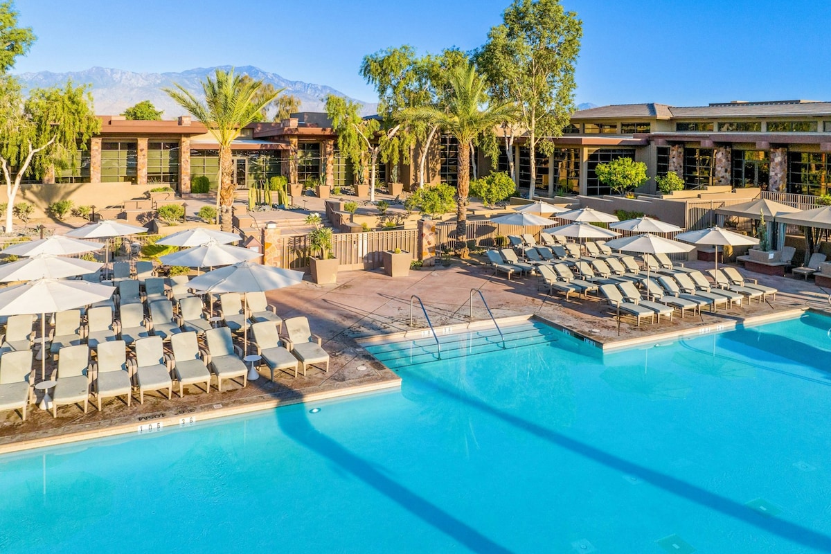 Welcome to the Palm Desert Lifestyle. - Stylish interiors with 1204 sqft of space, separated living areas, and outdoor patio. - Experience the comfort of a vacation home that feels like home. - Access to seven pools, championship golf, a fully equipped fitness center, and dining options on-site. - Breathtaking mountain views and proximity to attractions like Joshua Tree National Park and El Paseo shopping district. - Enjoy complimentary WiFi with no resort fees!