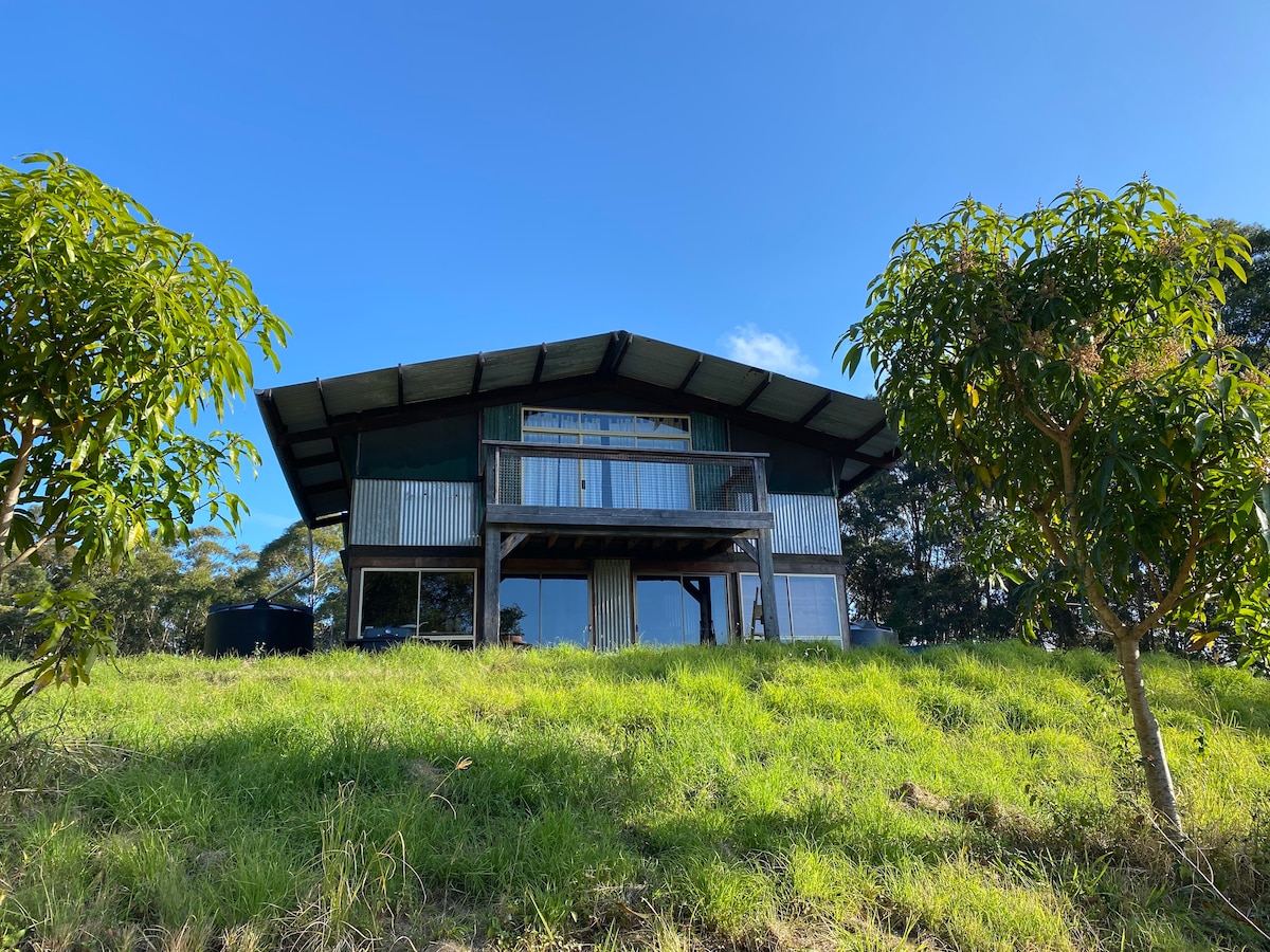 We are an Eco Retreat in the forest close to the beach, a wildlife loving surfer's perfect holiday accommodation. Access is via forest roads suitable for cars with higher clearance. The studio is run on a 12volt solar system. Upstairs is an open air (shadecloth rather than windows) loft with a deck. Downstairs is lounge, dining and indoor outdoor kitchen area. The middle level has an outdoor bath area, with compost toilet & gas fired shower. Shops & cafes 5ks. Pet friendly.