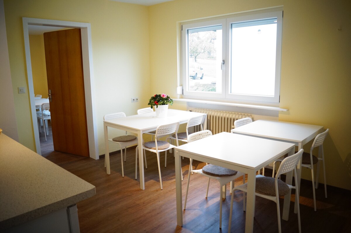 Located in the center of the wine village of Willsbach. Five minutes to Lake Breitenau! Scandinavian clarity – green as an accent color! New comfort - rooms on the upper floor with desk and high-quality office accessories. Purist and clear: the new bathrooms with shower and toilet. High-quality equipped shared kitchen with balcony and dining room. Modern mini apartments on the ground floor, special comfort single room with French bed each with mini kitchen and bathroom.