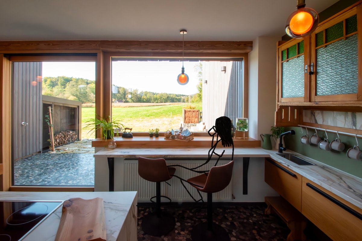 COME TOGETHER for group trips and family vacations: Exceptionally designed, completely private 100-120 m² design apartment surrounded by greenery with a magnificent ambience for gatherings of all kinds: Celebrate, cook, play, chat & retreat together - spacious, multifunctional living/dining/cooking area or lounge/home theater - Terrace with barbecue, playground and much more - 3rd bedroom 'Nest' can be booked (specify 6 adults), 2 children additionally possible in 'Etagerie' - Near thermal baths, lake, hiking & cycling area
