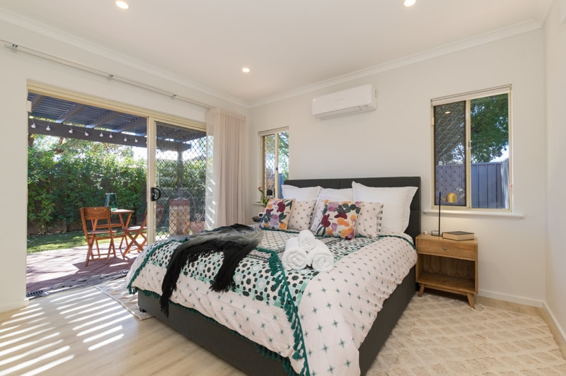 Modern interior. Thick walls with sunblock blinds, quiet despite street location. Spacious, pleasant deck with simple garden and colourful wall art. Aircon throughout. BBQ, outdoor setting. Wheel-chair friendly. Two TVs. Secure parking for 3-4 cars. Excellent location - walk to central Fremantle. Opposite the Fremantle Leisure/ Pool Centre and Fremantle park. Pets friendly on request. Two bedrooms & two bathrooms. Extra fee could occur if more beds used than booked.