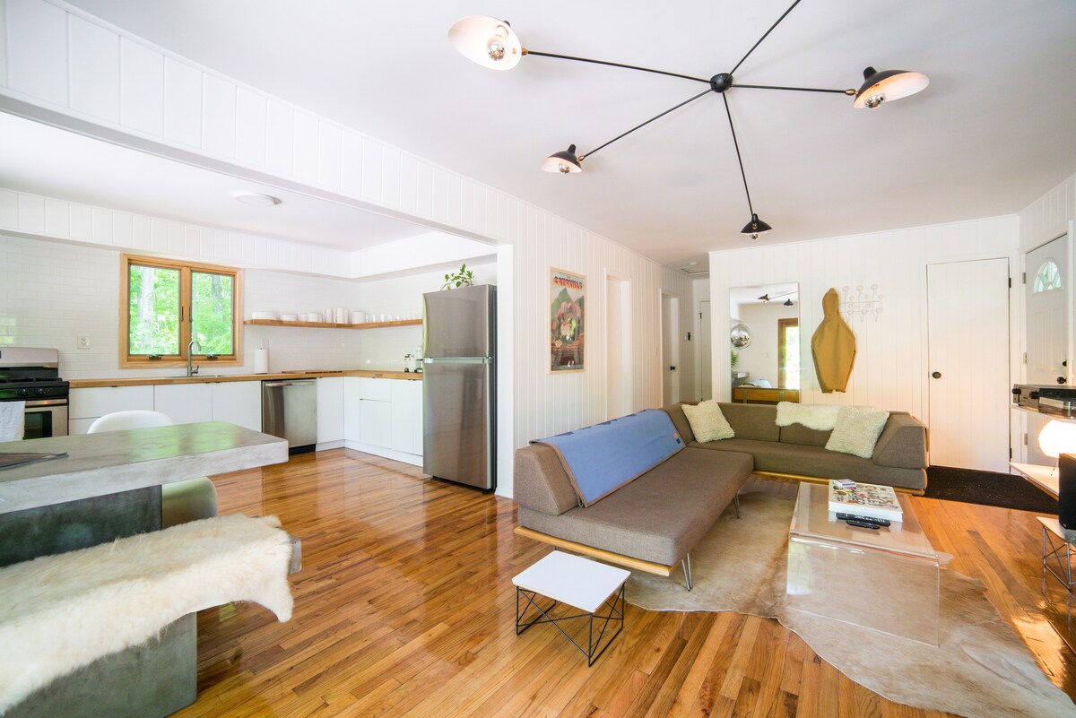 Newly renovated two bedroom, two bath cottage with four person barrel sauna at Swinging Bridge Reservoir, Sullivan County's largest motorboat lake. Updated amenities and mid-century and modern furniture provide a welcome respite from the city just 90 miles away. Take in the local scenery, catch a show at the Forestburgh Playhouse or stop into some of the local vineyards and restaurants. For a low key weekend, hang out by the fireplace playing some records and cooking a meal.