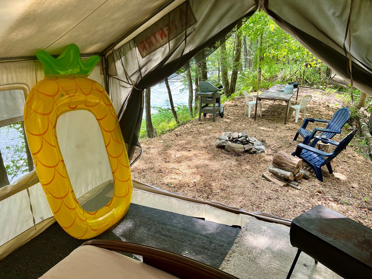 Nestled on your own 6 acres of pristine wetland, surrounded by acres of untouched woods, is our renovated and designed glamping camper and our additional glamping tent; complete with all the creature comforts to ensure your remote wilderness excursion is as luxurious and efficient as can be. The site sits in surrounded by giant pine trees and a large 12'x24' deck holds a bbq grille, outdoor dining for six, outdoor bed to lay back listen to the sounds of nature, and outdoor shower and outhouse