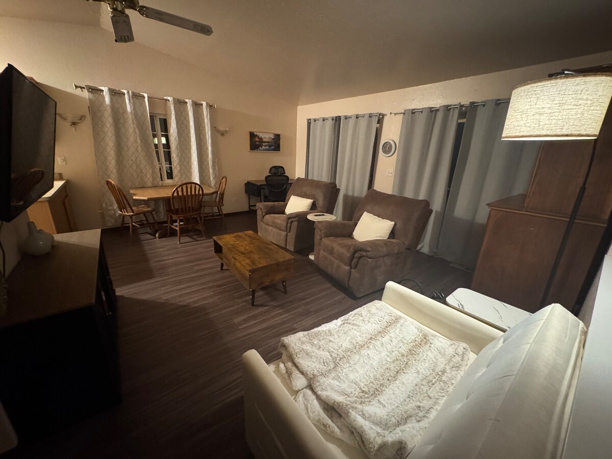 Enjoy a stylish experience at this centrally-located brand new studio apartment in a quiet neighborhood! Bright, clean, and cozy — the perfect home away from home. 1 queen bed 1 bath studio with kitchen located less than a mile to historic downtown Grants Pass where you will find amazing local restaurants and shopping! Space is a mile off I-5 and a mile and a half to the beautiful Rogue River. Guests will have access to their own private fenced patio complete with lights, fire pit and a bbq.
