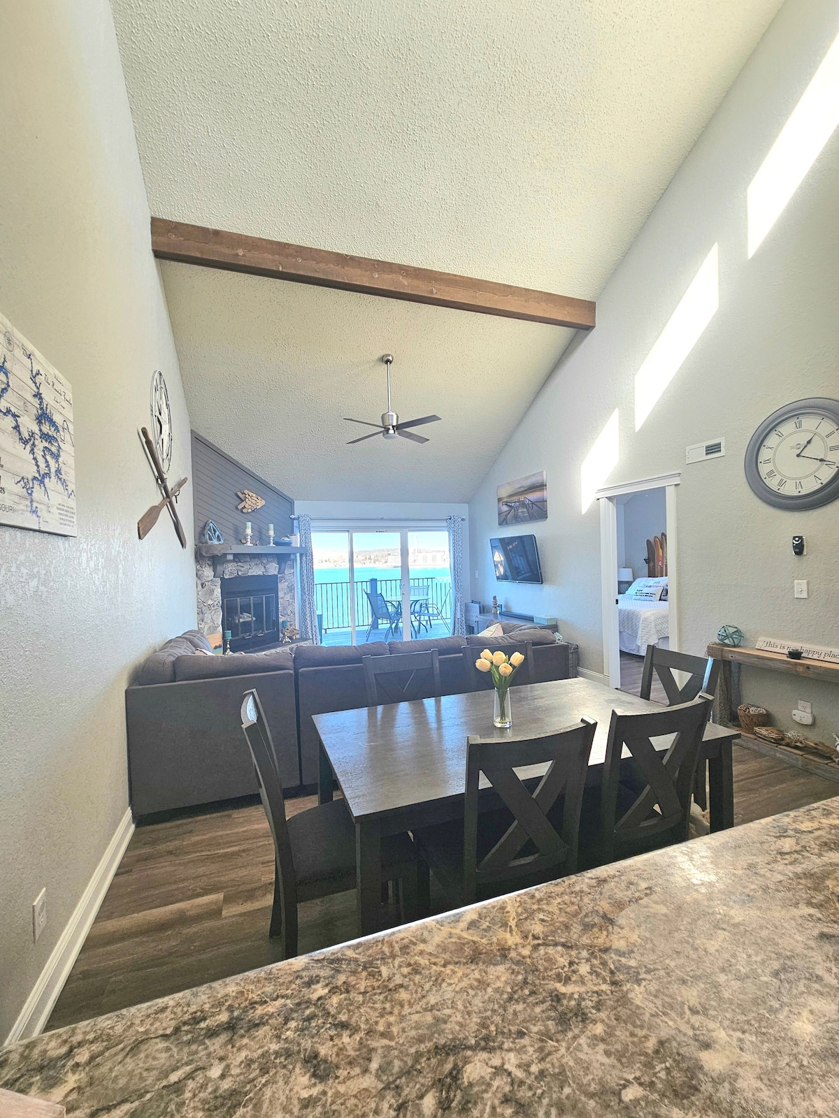 Entire lake house ready for your next lake retreat with family or friends. Spacious living area including outdoor deck space with a private dock and kayaks for use! Watch the sunset on the dock while grilling out or next to the gas fire pit. Cozy up next to the wood burning fireplace. **NEW LOWE Tritoon BOAT RENTAL option or space to side dock your boat. Close to the strip, grocery stores, and restaurants. Mini golf, go-karts, and a winery are also nearby. Perfect for a weekend or long get away.