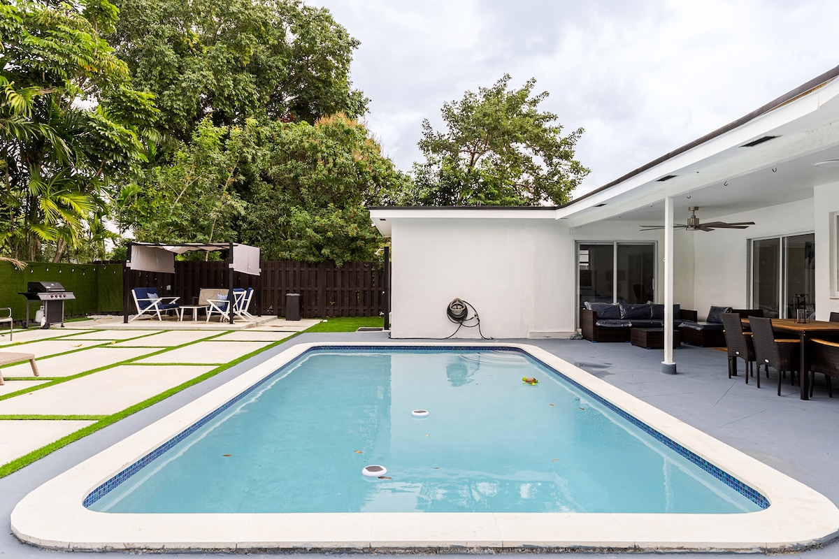 Sea Turtle Vacation Homes welcomes you to experience the perfect vacation in this immaculately clean, recently remodeled modern 3-bedroom home. Ideally located just 15 minutes from Las Olas, the beach, FLL Airport, Hard Rock Casino, Hard Rock Stadium, and the Broward Convention Center. The home sleeps up to 8 guests and features a shared heated pool with the neighboring unit. Enjoy amenities including a fire pit circle, artificial turf, night lighting, outdoor games.