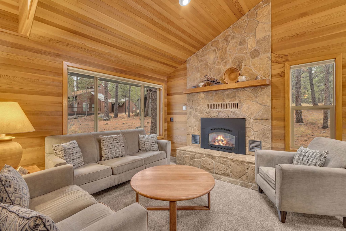 Room With A View Condo has a rustic feel with exposed wood beams, tall ceilings, an open floor plan and a large cozy stone fireplace. This is the feel you want when you vacation to Sun River. Stunning views of the rolling hills, and the Oregon Cascade Range including Mt. Bachelor and Broken Top are visible from the living room, deck, and your king size bed. Conveniently located a short walking path to Sun River Lodge, and The Village. Wifi, cable, smart TV, and DVD provided. Fully stocked.