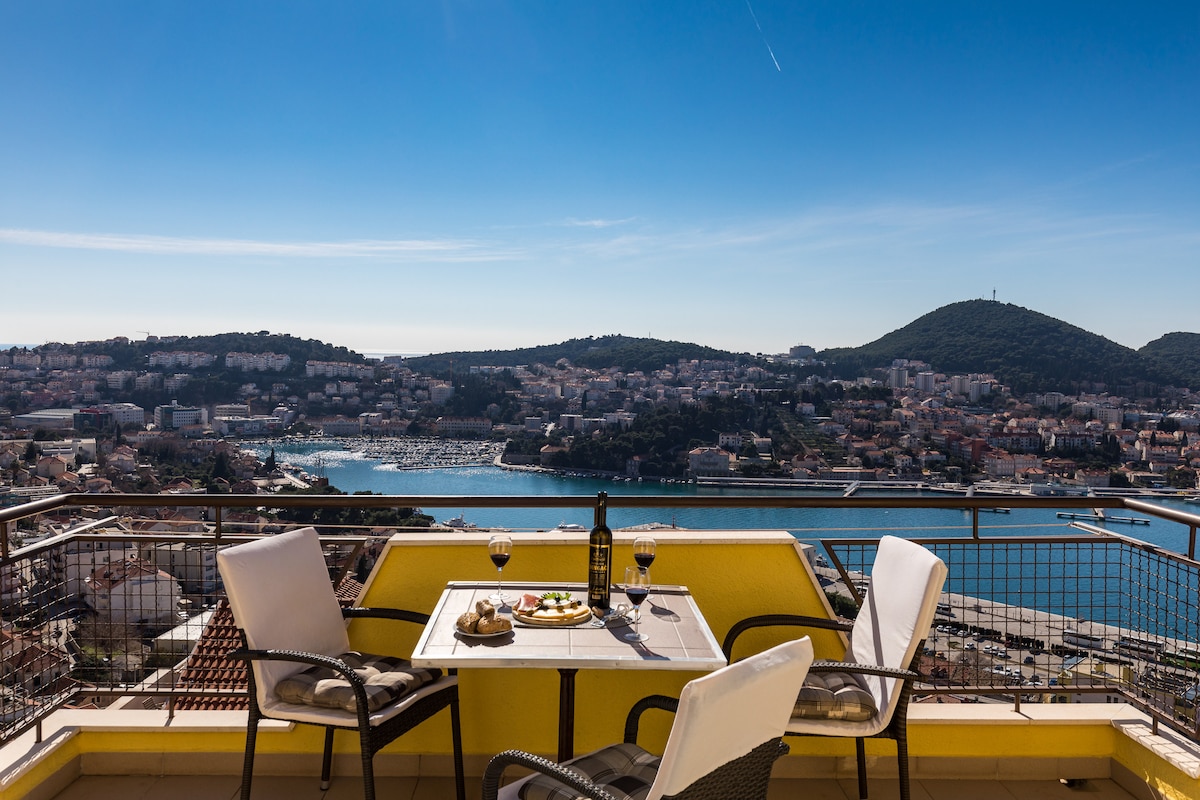 Our lovely apartment has 60 square meters, with huge 90 square meters terrace overlooking Gruž bay and Lapad peninsula. It is located in a quiet street with free parking available on site. Apartment well connected to other parts of the city. Harbor is 5 minutes away walking downhill, offering transportation and daily boat trips to beautiful nearby islands. The Old Town and the closest beach are located either 10 minutes driving or 25 minutes walking.