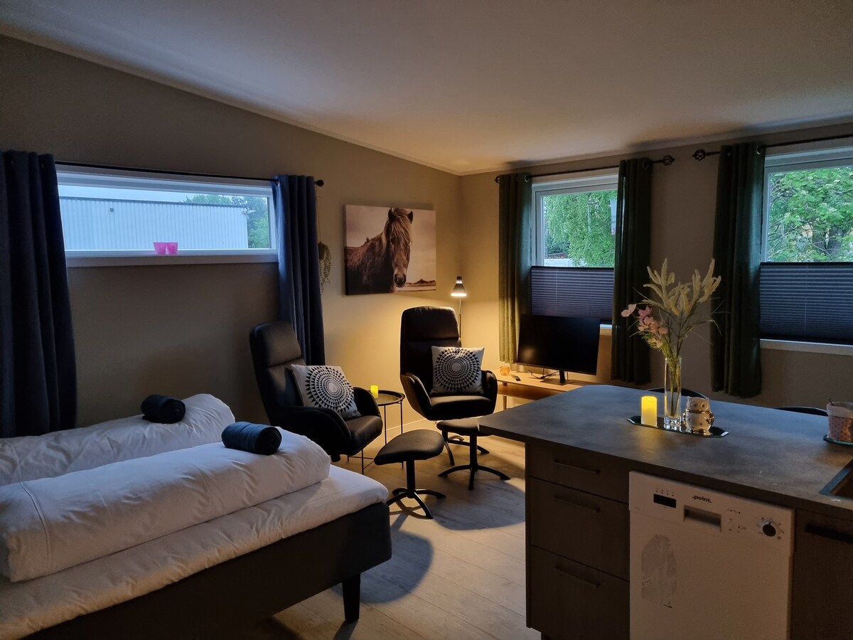 Simple and peaceful accommodation centrally in Leknes, in the middle of Lofoten. Studio apartment on the 2nd floor with a private feel. 27 m². Here you have everything you need within walking distance; shopping center, airport, bus terminal and restaurants. Private well-equipped kitchen all to yourself with dishwasher, toaster, kettle and microwave. Private bathroom with shower and washing machine. Towels and bed linen included. An excellent starting point for excursions in Lofoten.