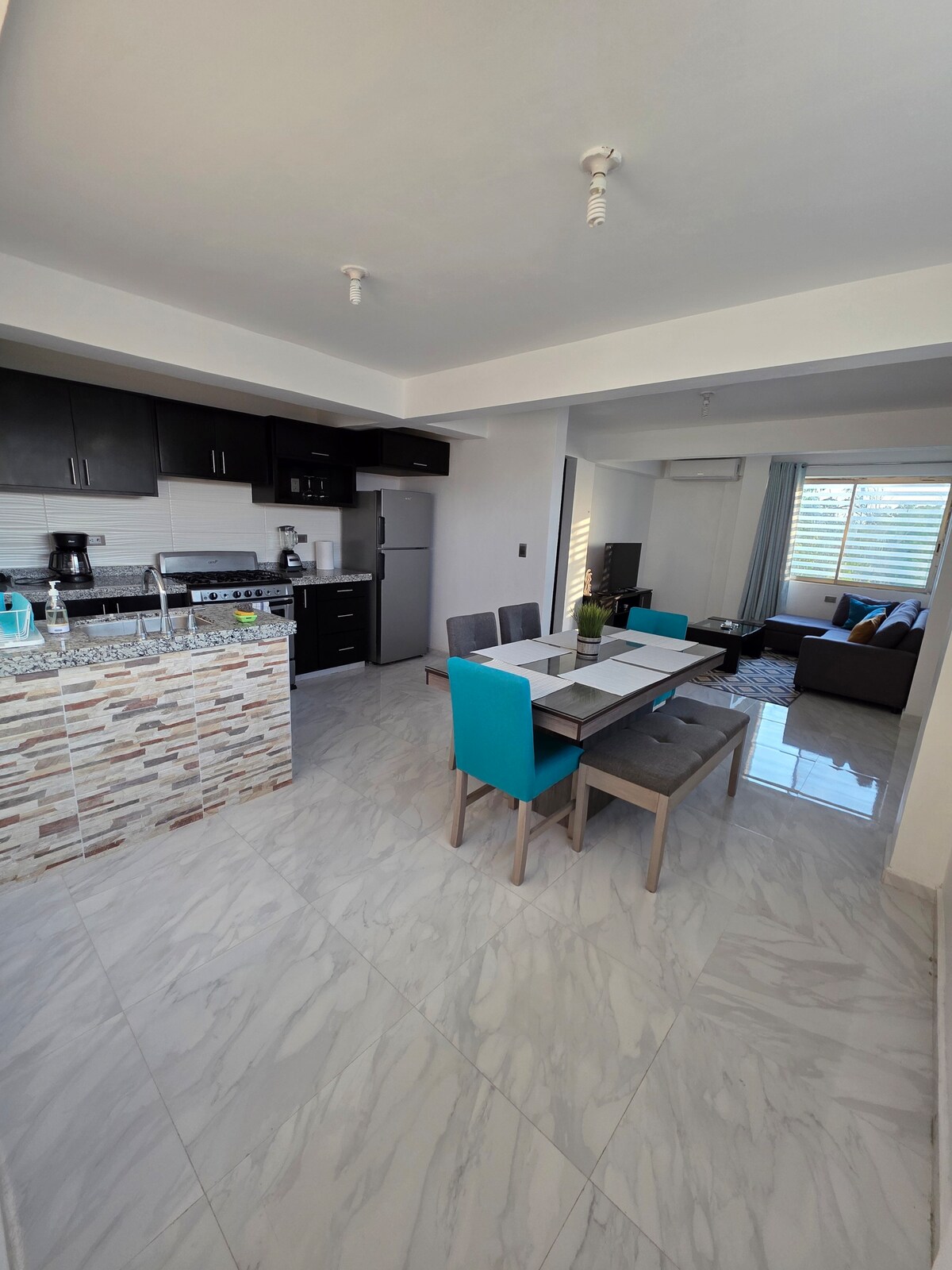 Complete, elegant and spacious apartment, in a residential development, safe, quiet and ample parking. Very good option to come with the family or to work 1 or many days. It has all the amenities to be in a comfortable and pleasant space. Everything for cooking, working, resting, entertaining. It has a Bluetooth speaker, Smart TVs to watch Netflix, Prime, etc. It also includes a washing machine, and a small laundry area. Well located and shopping very close.