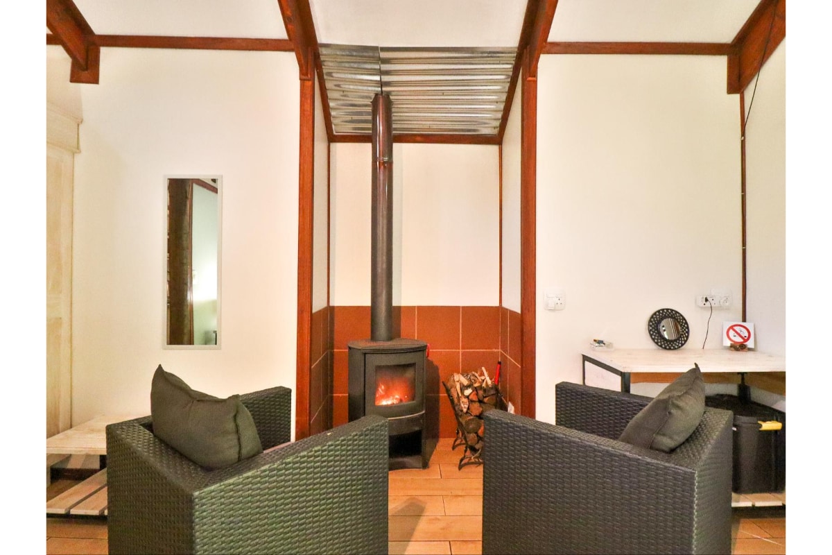 The Chalet has as Double bed and en-suite bathroom with shower only. Its kitchen has a tea and coffee station, fully equipped kitchen with a microwave and stove. The airconditioned unit overlooks the garden, and braai area. All units are loadshedding proof.