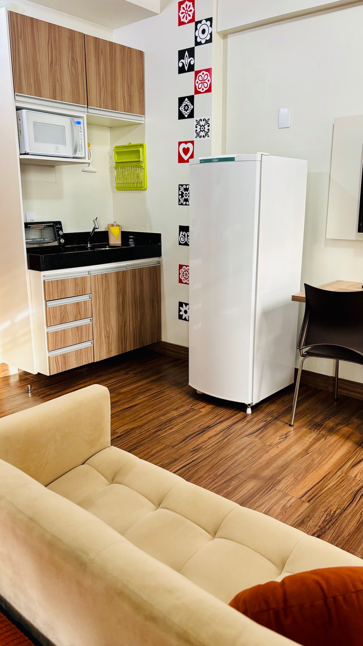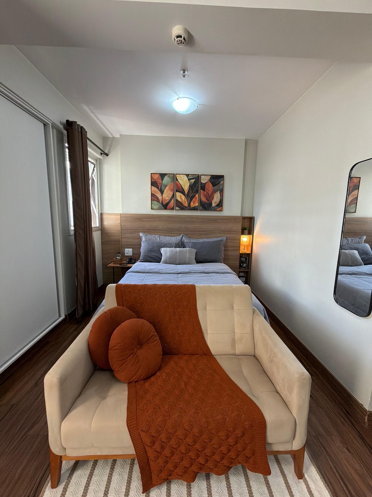 Comfortable space in the Northwest - prime area, close to Boulevard Shopping, supermarkets, bars, pharmacies, laundries and bakeries. With finely designed furniture in all environments, the space features televisions, air-conditioners, kitchen utilities, an oven, stove, refrigerator, microwave, sandwich maker, coffee maker, hairdryer, electric towel rack, work desk, double box bed and sanitized bed and bath linens. It includes private parking and a door with automatic lock.