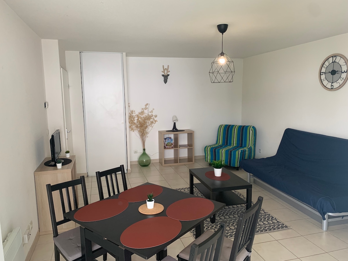 Refurbished apartment decoration cocooning tone beige and blue for the main room. private covered terrace .plancha pool , Apartment that can accommodate up to 4 people not to eat and drink in the room and on the sofa . No smoking inside . Pets not allowed. any damage, breakage or theft will be reported to airbnb. The apartment is not suitable for people with limited mobility