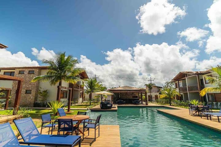 Beachfront house on the Maraú Peninsula, steps from the paradisiacal Cassange Beach. Enjoy a stunning ocean view and direct connection with nature. The condominium offers 2 swimming pools, massage room, tennis court, and gym. The house includes dedicated Starlink internet, ensuring fast and stable connectivity. Perfect for vacations or unforgettable getaways, ideal for those seeking comfort, exclusivity, and tranquility year-round.