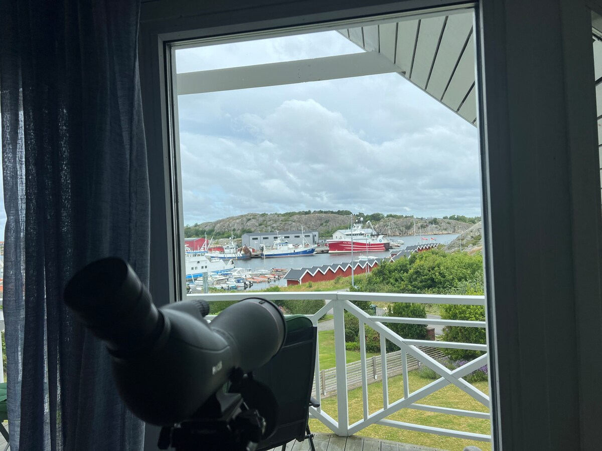 Ett stenkast från hav och salta bad. Plats för den stora familjen. Det finns badtunna på tomten och en liten lekplats för de små barnen. Gott om plats på altaner runt huset. Dessutom balkong med utsikt över hamnen och solnedgången. Det finns 3 dubbelrum, ett enkelrum och ett sovloft för två. Spjälsäng för små barn finns också. Vardagsrum, matsal och en mysig lounge på övervåningen. Utsikt över hamnen med fritidsbåtar och fiskebåtar. På Styrsö finns två matbutiker och 4 restauranger.