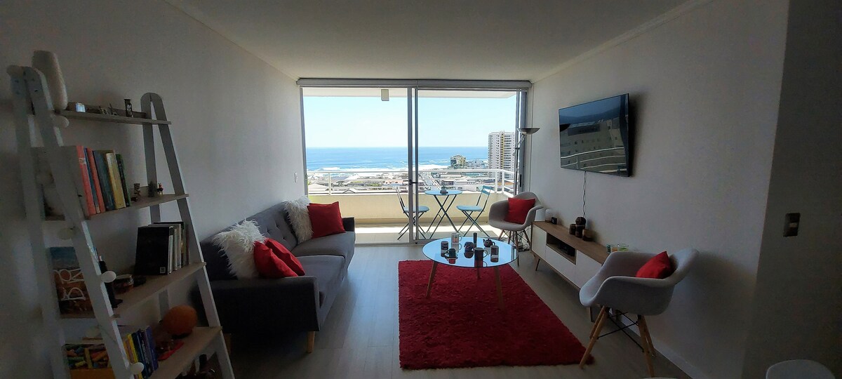 I rent a beautiful apartment by the day, in front of Playa Brava in Iquique with a nice ocean view from its terrace. The apartment is located on the 6th floor, has 1 bedroom with a European bed for 2, a living room, an equipped kitchen, a bathroom, a washing machine, and a terrace. You have restaurants, pubs, cafes, supermarkets and pharmacy just a step away, everything you need for a comfortable stay with your family. And if you want to take a walk, you have the beach in front with games for the kids, ideal!