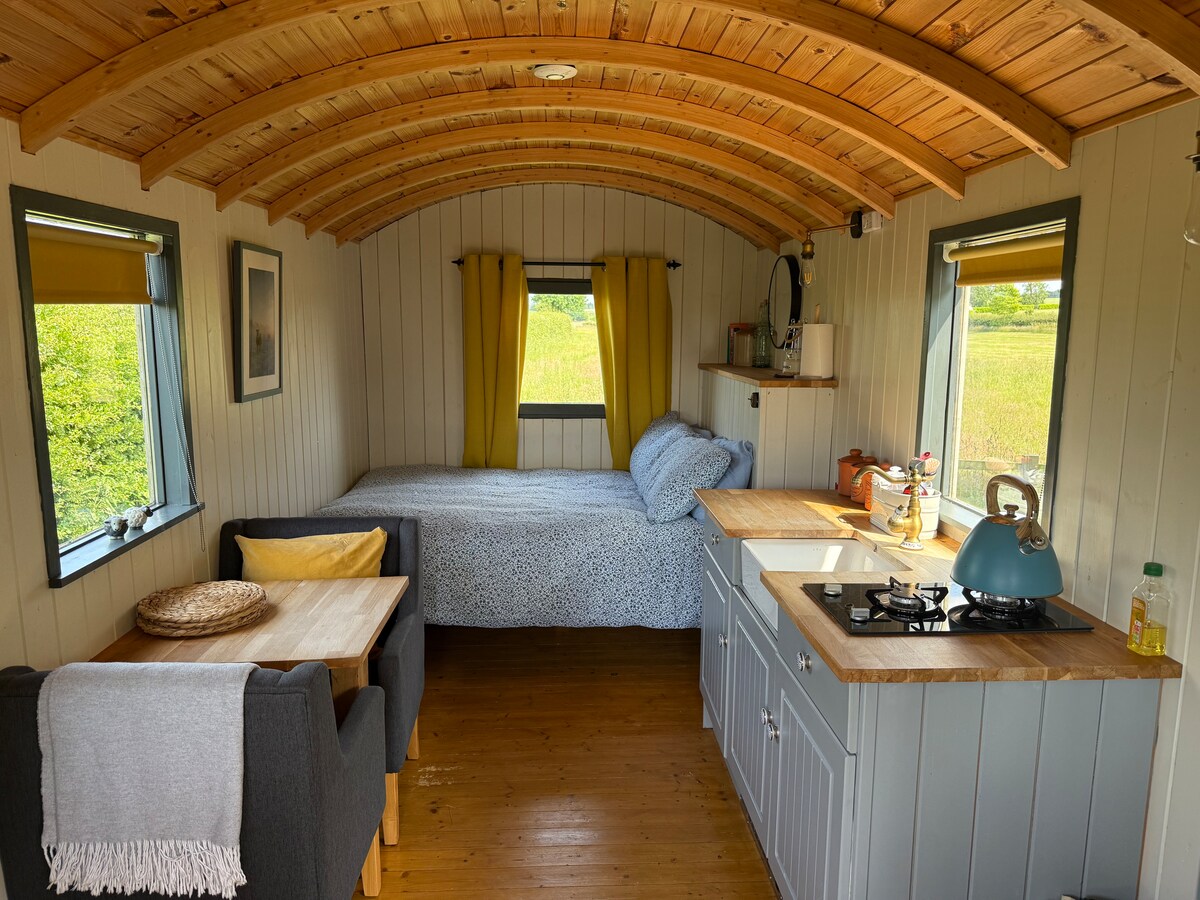 For over a hundred years, this characterful old dairy was where the cows were milked at Hawthorn Farm. Sympathetically and luxuriously converted into a two-bedroom cottage in 2017, it is self-contained and completely detached. Inside, original walls, beams and vaulted ceilings give it a spacious, airy feel. It has its own fully-equipped kitchenette, and a bathroom with a large shower, WC and basin. The spacious 18 x 14 foot carpeted living space has two huge comfy sofas and a table and chairs.