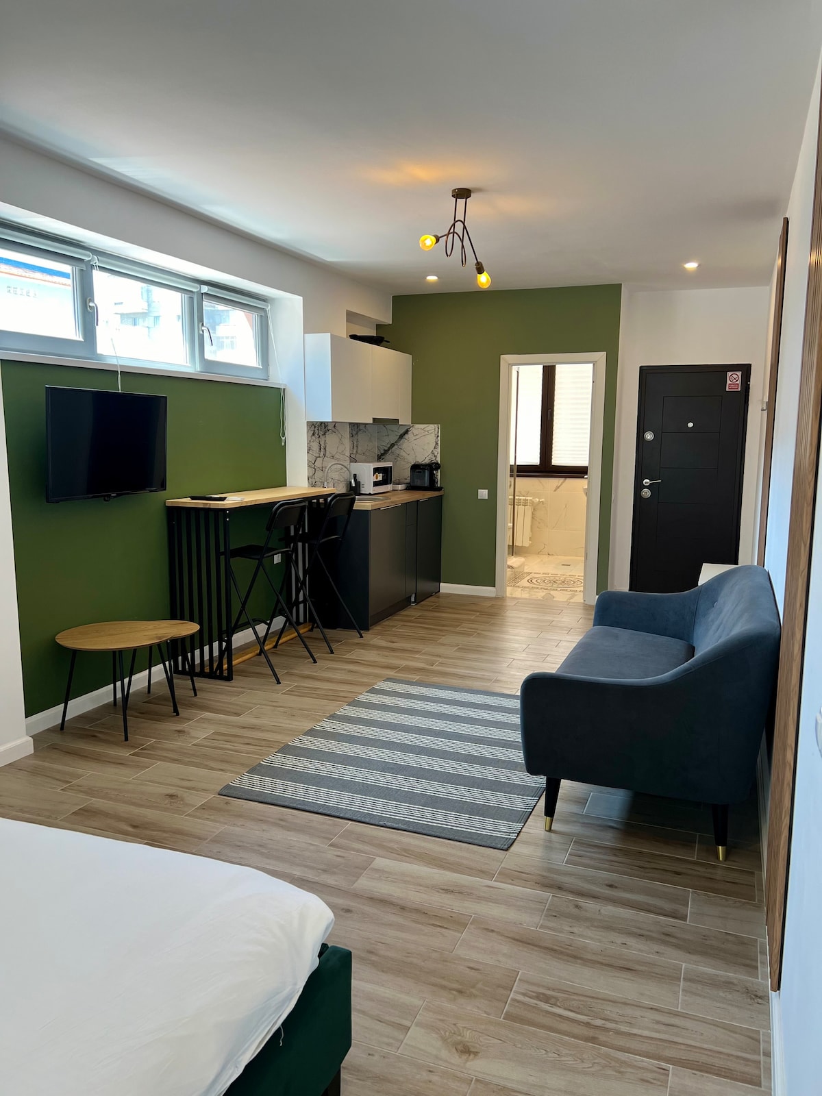 Bright and spacious studio apartment located in a 10 floors building, newly renovated with a fully equipped modern kitchen with an electric hob, integrated fridge and refrigerator, and all other necessary kitchenware for making a gourmet meal. It is placed in a great area with quiet neighbourhood, less than 15 minutes to City Centre, with direct public transportation to the old town, close to a big variety of beautiful parks and lakes such as Tei, Plumbuita, Circului. Free car park available.