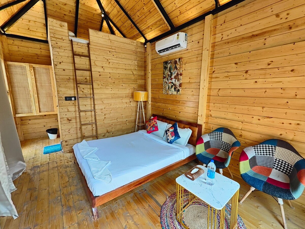 This stylish place to stay is perfect for party gatherings, wooden cottages experience with ample open space where u can sleep under the stars, enough space for two adults and two kids , good for group parties upto 6 people