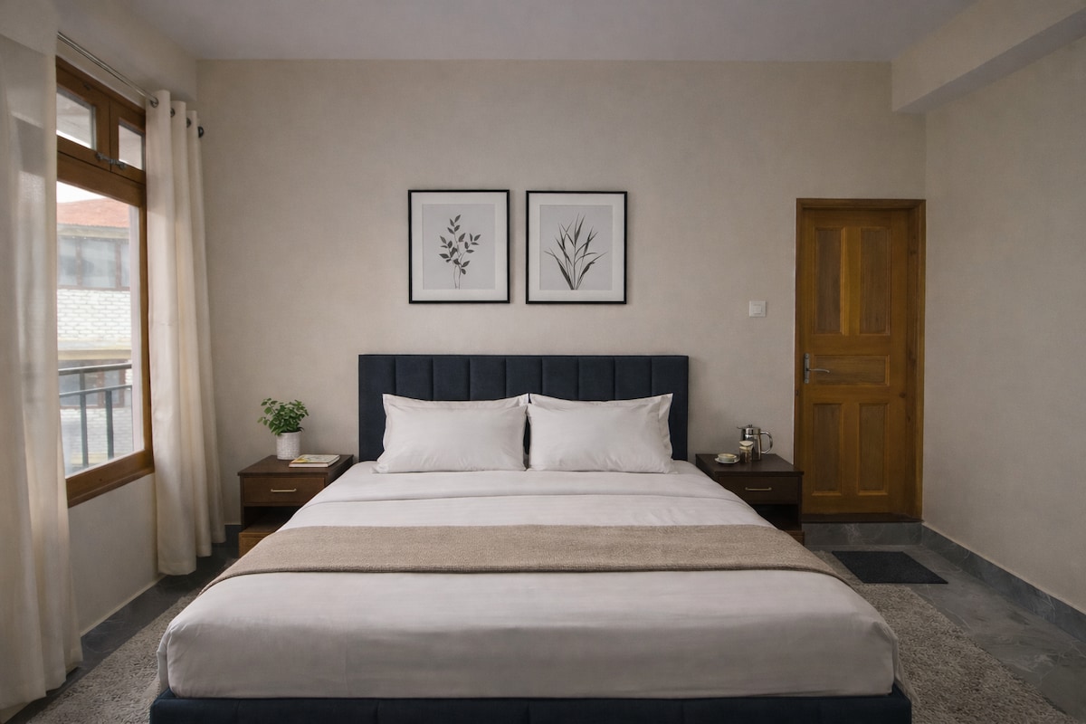 Away from the hustle-bustle of the town, enjoy a comfy stay in our homestay, which is in the forest but still town, hospital and bus stand are 5 minutes drive away from the property. Sit and gaze at the stunning view of Kailash range. With spacious luxury bedroom cum living area, private bathroom, kitchen, lawn and terrace, there's space to comfortably accommodation of 4 people. Perfect place for work from home.