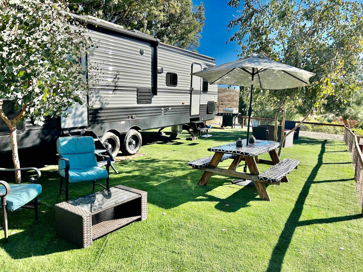 Our brand new RV is located in the heart of wine country. You can see the vineyards from the many panoramic windows throughout the trailer. You have your own private fenced in backyard and will be able to have our furry residents visit you throughout the day. Enjoy your morning coffee while seeing hot air balloons fly by or have a glass of wine by the gas fire pit while enjoying breathtaking sunsets. Our property is right next to the lake skinner as well as many wineries.