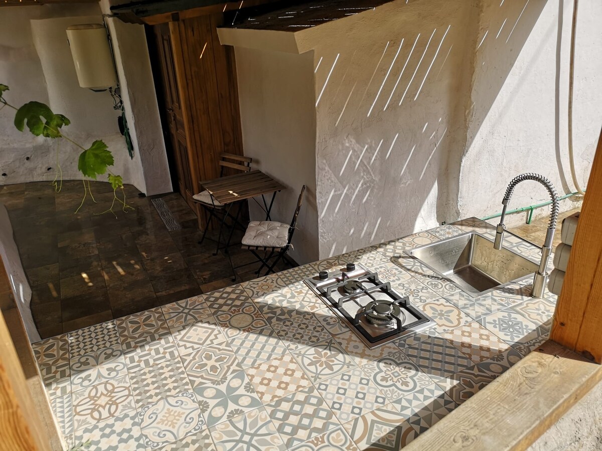 Small stone and wood house, on a plot shared with the owners' house and another holiday home above the owners' house with independent entrances. Small non-heated pool, covered barbecue with gas kitchen, garden, chill-out area, and solarium shared with the other 2 guests. Interior: kitchen, small table and 2 chairs, bathroom with shower, small living room, SmartTV, wifi, air conditioning, and bedroom with 160x200 bed. There are 3 very friendly dogs (golden retrievers) roaming freely.