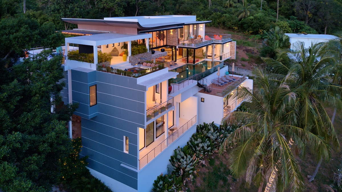 Your luxury private pool villa located on hilltop close to famous “Four Seasons” hotel. More photos on Villa Insta account : @thegreenvillakohsamui Regardless of the existing 6 rooms, PRICE IS GIVEN FOR A 4 ROOMS OCCUPANCY (8 adults). Should want to extend your booking for additional rooms, please make a request. BREAKFAST IS INCLUDED + IN-HOUSE MAID 8hrs/day & 6/7days + Free Airport Transfers. Julie, your host, will welcome you and will take care of all your needs