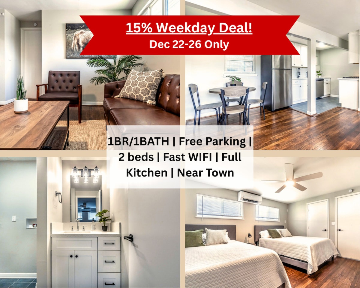 Welcome to your Montrose retreat! This 2BR/1B loft features comfy king beds, free parking, and speedy WiFi. Relax in the cozy living room with two couches, a TV, and a workspace. Enjoy the private patio or cook in the full kitchen with a gas stove. Located in the heart of Houston, you're minutes from top restaurants, bars, museums, and stadiums. Whether you're here to explore or unwind, you'll love the bright, inviting space!