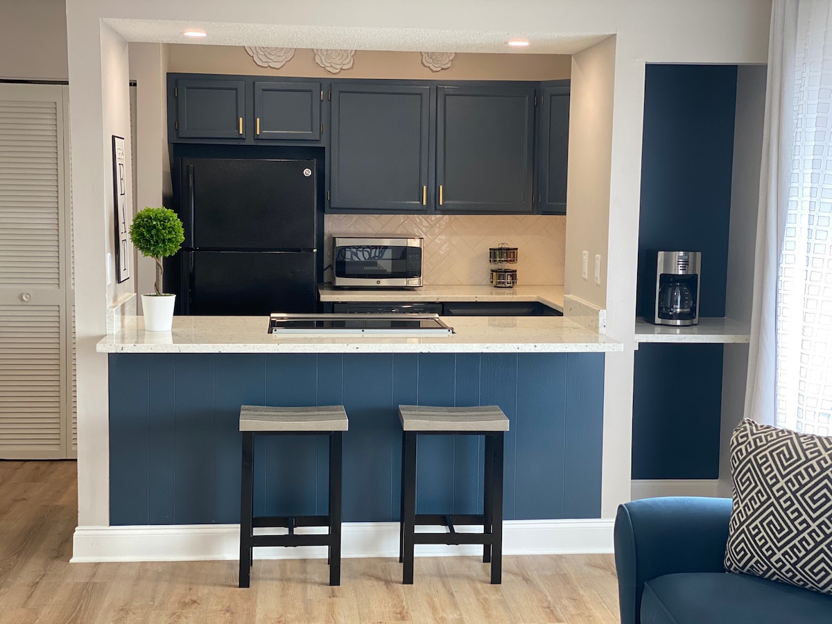 ***Beach service at our private beach for 2 included**** A beautifully decorated studio condo that sleeps 4 comfortably. It includes a queen size bed and queen size sleeper sofa with a memory foam mattress. Not to mention a breakfast bar and 55” TV with surround sound. You can stand on the back deck and see views of the sugary white sand beaches that are right across the street from our place. Beach service at our private beach for 2 included from March-October.