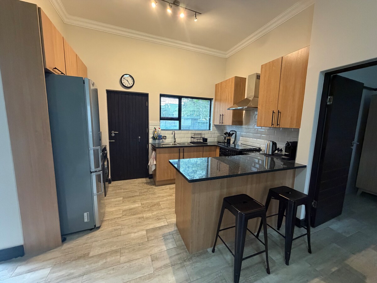 Welcome to your peaceful home away from home, in the beautiful, green and secure surroundings of Thornhill Estate. Enjoy the comfort of controlled estate access, 24-hour security patrols, & a calm, residential atmosphere. This stylish 2-bedroom, 1- bathroom (shower only) Guesthouse, offers the perfect Family escape. Just 10–15 mins to OR Tambo International Airport, 5 mins walk to Flamingo Shopping Centre. Nearby Golf Courses, Padel Courts, Nature Reserve, & local shops for nature & lei