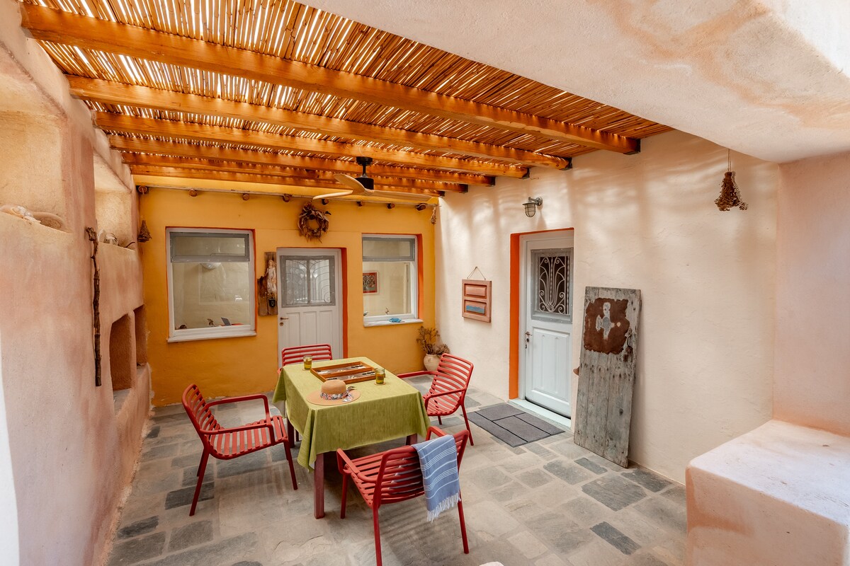 It's a cottage house on a very quiet and peaceful place on the northeast side of the island. You have an amazing view to the Aegean Sea, which gives you the opportunity to relax and rest while being on your vacation. There is one master bedroom with a queen bed with a Grecostrom Bodytopia Series matress and two single beds in the resting area which is shared with the kitchen. It's also fully equipped kitchen and a bathroom, which will give you the ability to enjoy your vacation at your own pace.