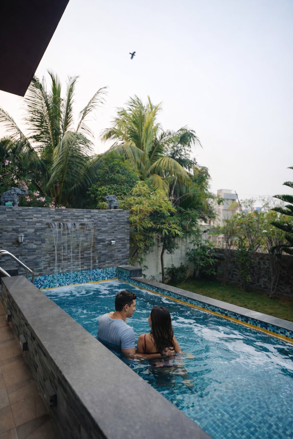 Spacious, calm villa near the beach & UNESCO monuments. Well suited for families, friends, and group stays who value space, breeze, & a relaxed atmosphere. • 4 A/C bedrooms with attached bathrooms • Extra mattresses available • Fully equipped kitchen for cooking • Tropical garden, sit-out hut & large breezy terrace • Plunge-style mini pool (for sitting & splashing) • Private parking for 5 cars, 24/7 CCTV Pet-friendly & unmarried couples welcome. Decorations on request. Food delivery available.