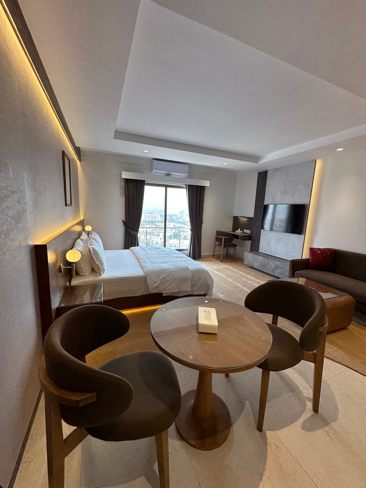 Luxury 2BR apartment in Islamabad with warm wooden interiors, cozy balcony and sweeping city views. Enjoy rooftop pool, steam and sauna access (extra charge) and dining at the on-site restaurant. Features include a 65" Smart TV, dedicated study desk, washing machine, reliable power backup, elevator and parking. Self check-in for effortless arrival. 10 min to DHA/Bahria, 15 min to I-8. Fast Wi-Fi, essentials, and 24/7 host support. Professionally cleaned. Note: Unmarried couples not allowed.