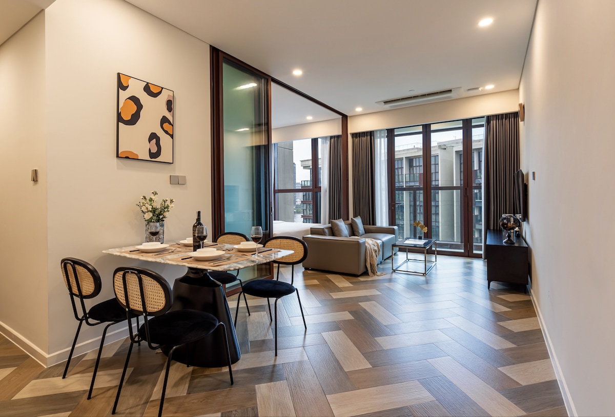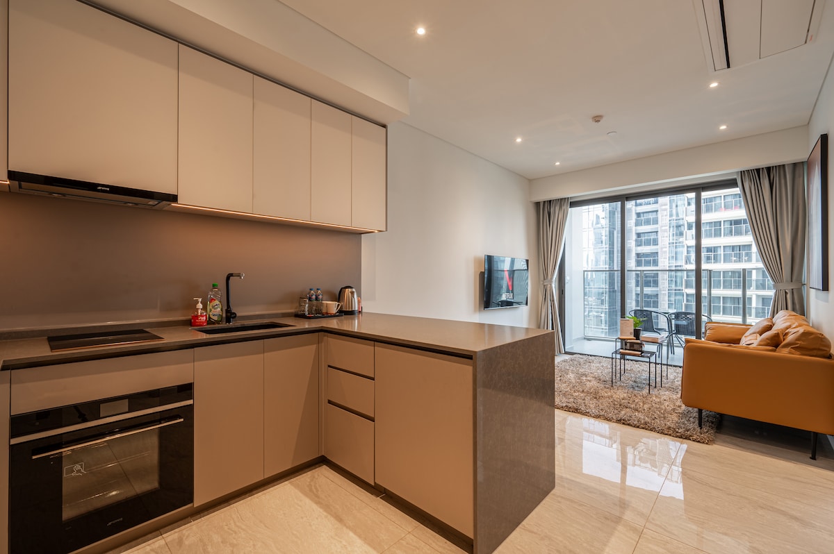This unique place is designed for a luxury-in-style experience. With a smart sliding door, your living room and bed room are easy connected to maximize spacious 50m2 house. Walking on the BaSon bridge between the condo and D1, you can feel the breeze of Saigon river and spectacular view of the city. By just 5 to 10 min on cab, you can get to city center.