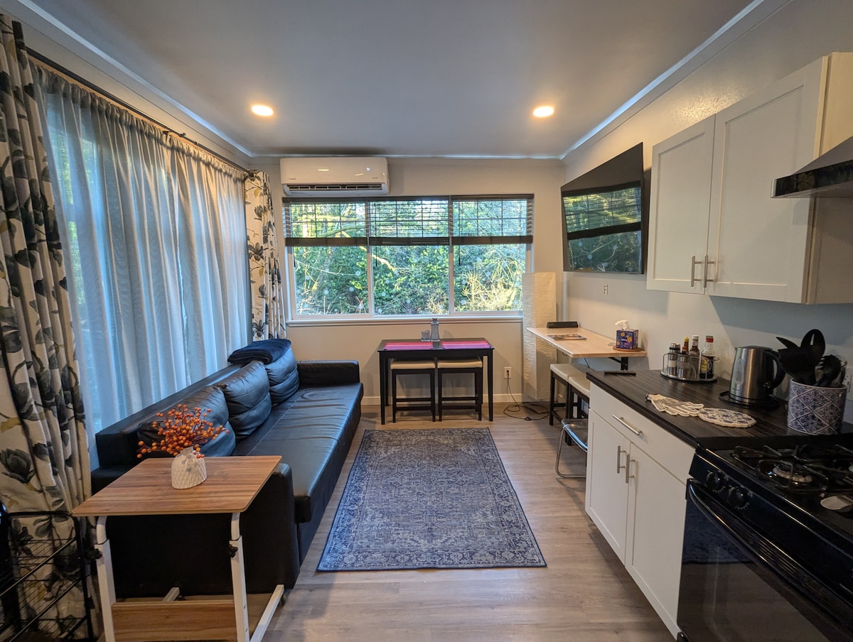 No animals/pets allowed. Located in town, 4 mins drive to Downtown Olympia this is a very popular home-base to explore the Pacific Northwest, or if you are in town for work. Super close to the Capital Building, State Offices, downtown and all amenities. Remodeled in 2019, there's a full kitchen with lots of breakfast & snack options provided. The sprawling bathroom has heated floors, a 5 ft shower & a Samsung full size washer-dryer.