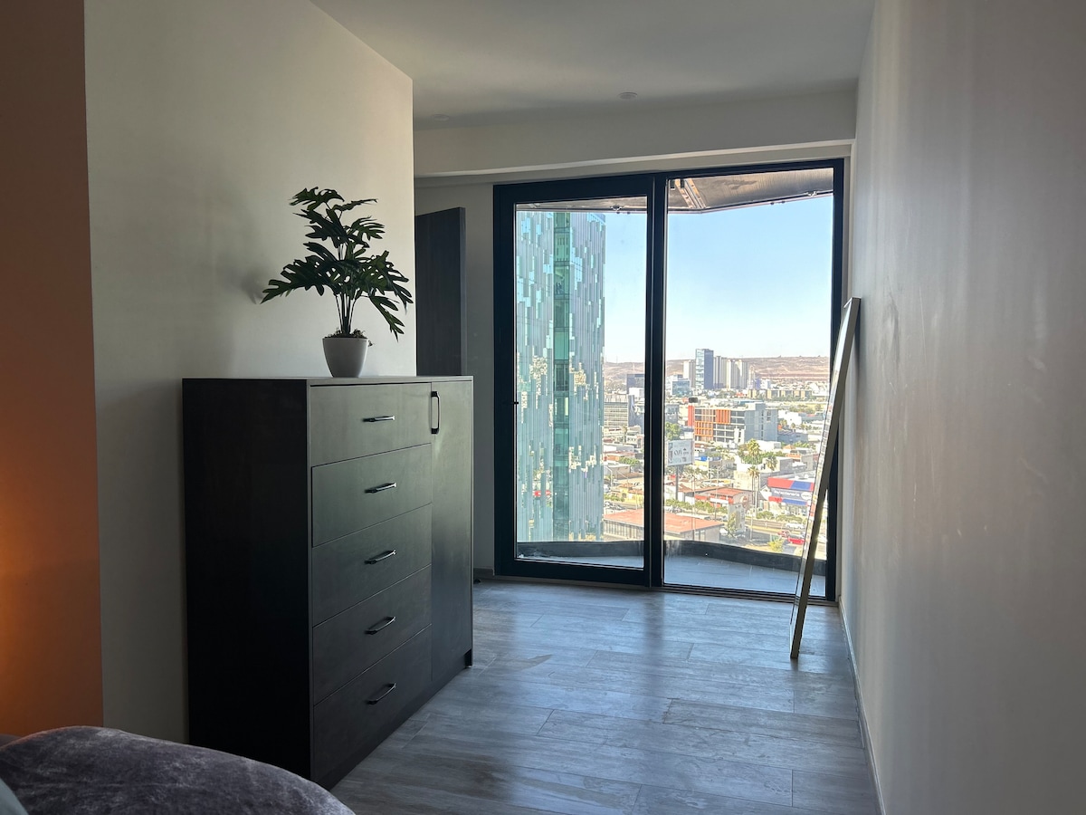 Enjoy the comfort of this new, quiet and very central accommodation. Great view and magnificent location just 5 minutes from the Mexico-USA border. Just a few blocks from the vibrant Av. Revolución. Steps away from restaurants, nightlife and doctors' offices. It has 1 bedroom (1 queen size bed + inflatable mattress), 1 50" TV with apps: HBO, Netflix, MLB. Kitchen utensils, washer, dryer and iron, hair dryer. Free parking with 24/7 security
