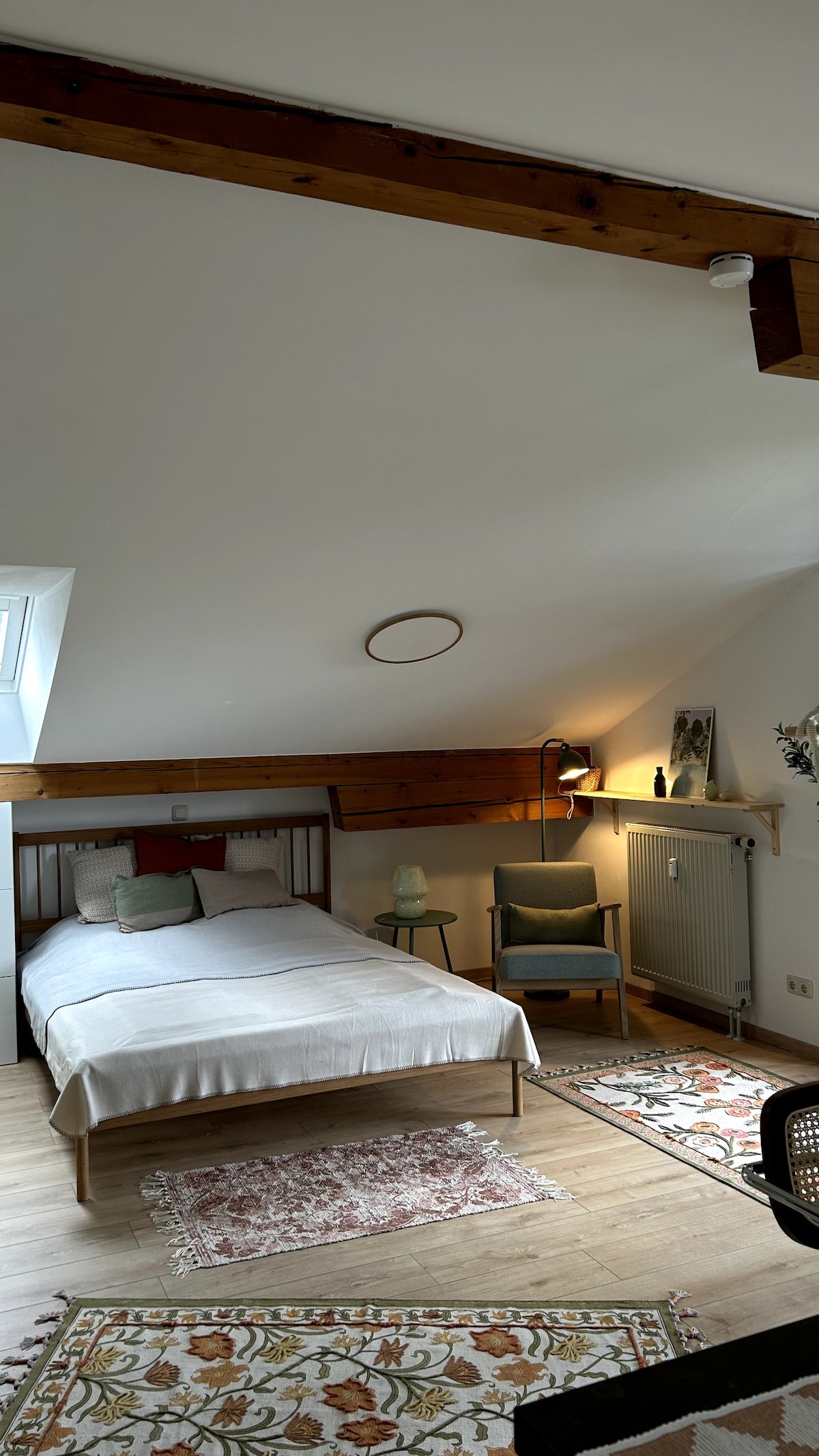 NIKA Loft is a stylishly furnished 70 sqm attic apartment in downtown Rosenheim. During the core renovation 5 years ago, practically everything was renewed, except for the old roof construction, which gives the apartment a lot of charm and warmth. The advantages of the apartment are the quiet location with simultaneous proximity to the center and train station (10 minutes' walk), the spacious living space, 1 private parking space + public parking spaces in front of the door and the proximity to nature with the state horticultural show grounds.