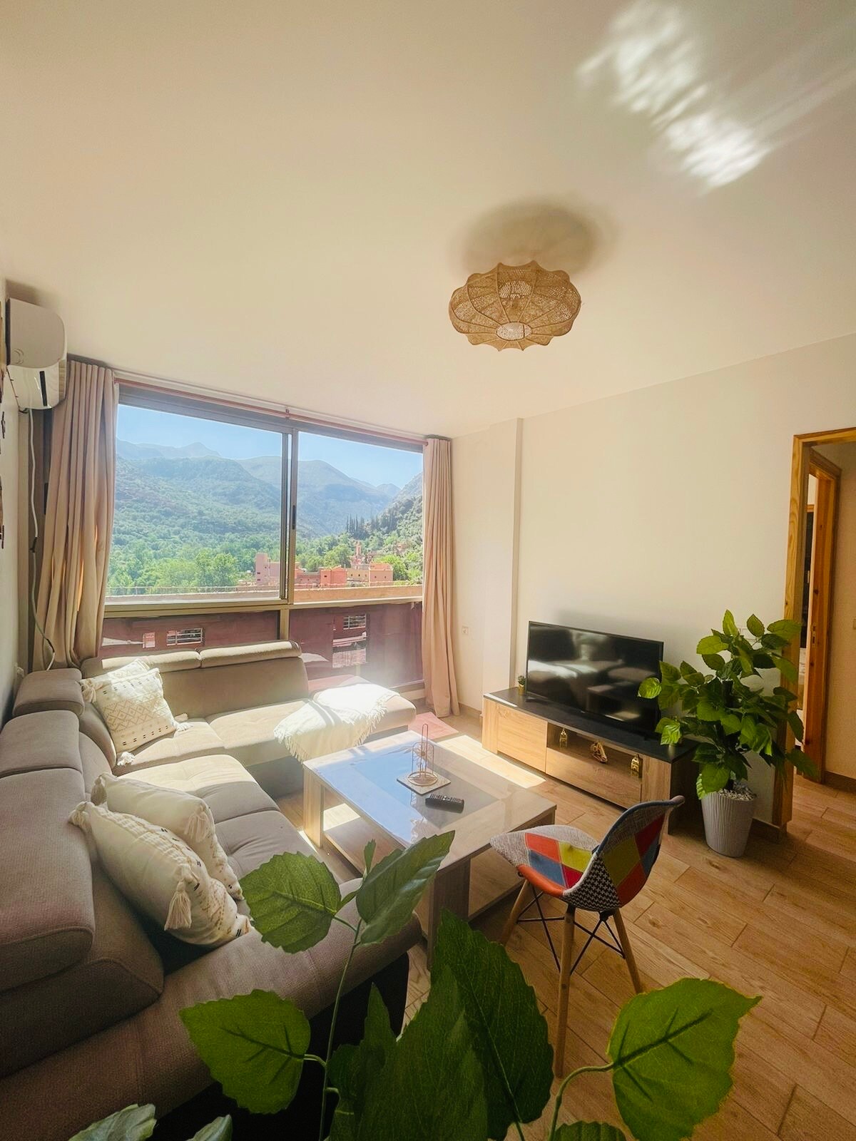 Enjoy a relaxing stay in this beautifully designed apartment offering breathtaking panoramic views of the picturesque Ourika Valley 🏞️and Atlas Mountains.⛰️The space is thoughtfully decorated with traditional touches, providing both comfort and style for your stay. Enjoy a morning coffee on terrace, you'll be captivated by the natural beauty surrounding you. Perfect for couples, solo travelers, or anyone seeking a tranquil retreat, this apartment offers the ideal serene landscape.