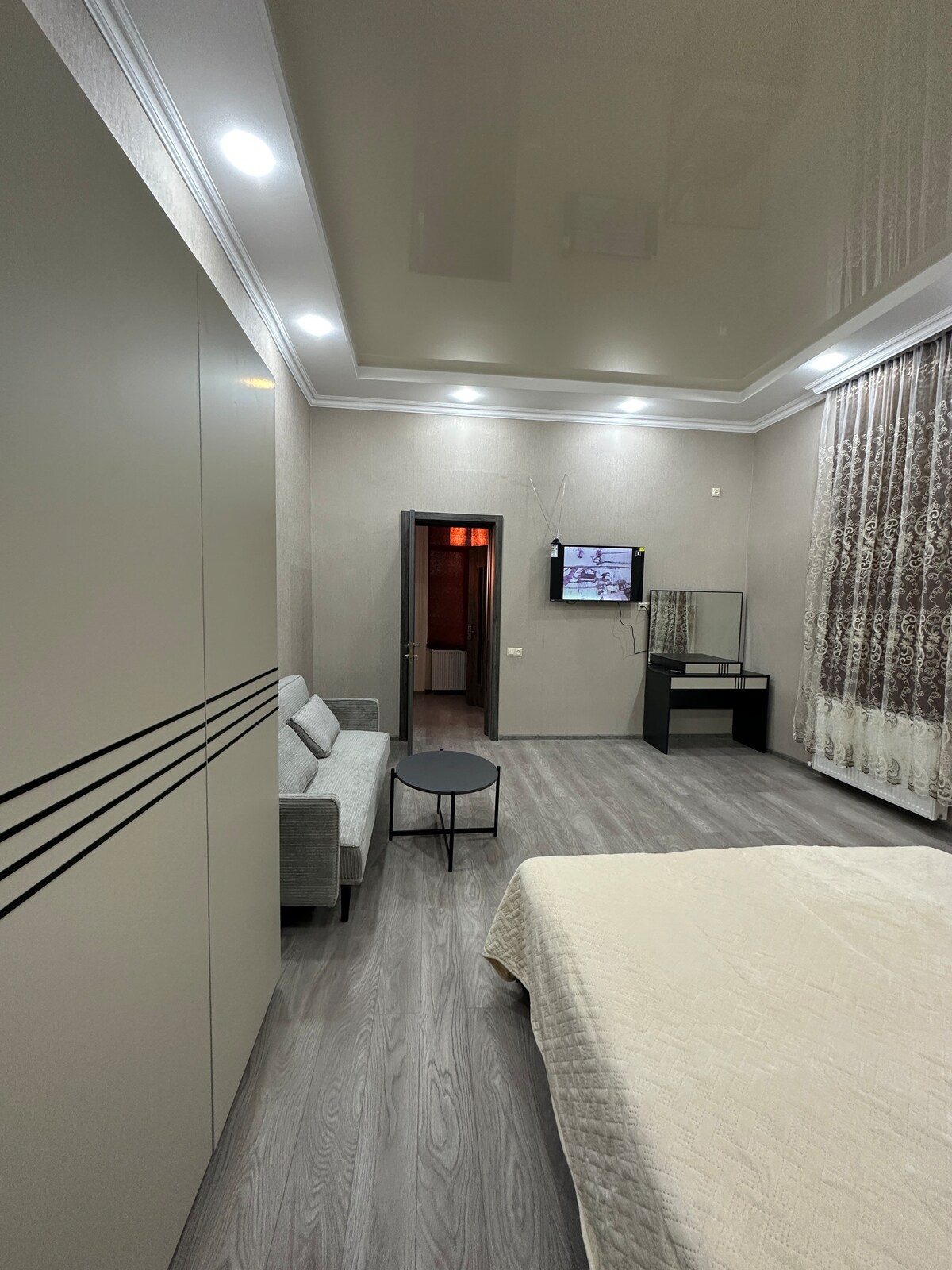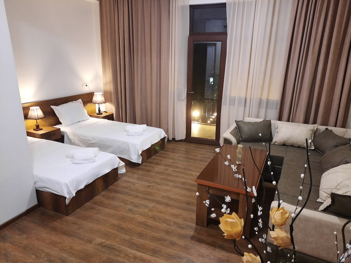 Our brand new apartment is located in a cosy environment at 4 Korkia Street (entrance from Tamar the Quees Street) in the very center of Kutaisi city. There are 2 bedrooms, 2 bathrooms, spacy living room with TV, kitchen, air-conditioning, heating and all necessary things that the guests might need. Our guests will feel a very comfortable atmosphere in our apartment which is located within a few minutes walking area from the main square, markets, restaurants, bars and bus stops.