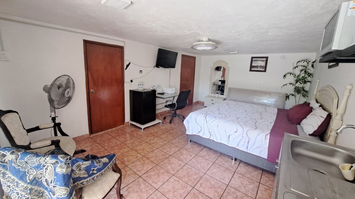 Pleasant studio apartment with one double bed, private bathroom, and shared terrace, equipped with a mini-fridge, microwave, coffee maker, and desk. Located in a quiet residential area with an excellent location. Close to places such as: Midtown Shopping Center, Sao Paulo Mall, Country 2000 Hospital, Mexico American Hospital, Light Rail Line 3 Station, casino, pharmacies, churches, the Historic Center, bars, and restaurants.