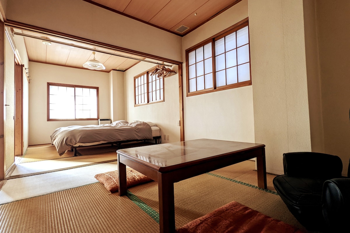Welcome to the Yukiguma Lodge, a family-run Japanese-style hotel, offering private rooms with shared amenities. Enjoy the comfort of our cozy double room with comfortable futons on traditional tatami flooring. The room features individual heating, ample storage, and access to high-speed Wi-Fi.