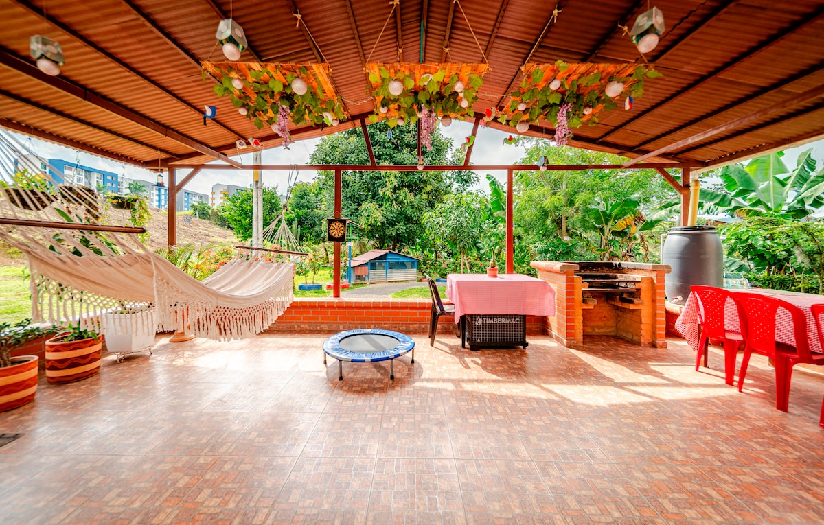 Country House in Pereira, Sector Cerritos, Easy Access. You will enjoy sunny days, tranquility, connection with Nature, and beautiful sunsets. Overlooking a spectacular guadual. Located 15 minutes from the International Matecaña Airport, with an excellent location to places of interest in the Coffee Region; 5 minutes from the best food malls in the city, supermarkets. Perfect place to enjoy with the family. With heated Jacuzzi, BBQ area, wood oven for pizza. Campfire area. Pet Friendly.