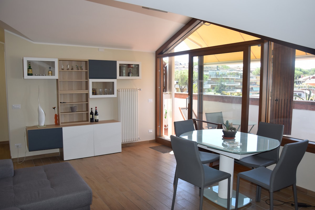 Be dazzled by the Roman light in this apartment with its light and dreamy lines. The attention to detail is reflected in the ability to harness the light between spaces and furniture, to make it smiling and cozy comfort. Seventh-floor penthouse of an elegant building located in Rome's center with a large terrace overlooking Monte Mario Park and from where you can admire St. Peter's dome. Ultra-fast wifi. No children Check-in 9 p.m./11 p.m. Extra €50. No check-in after 11 p.m.