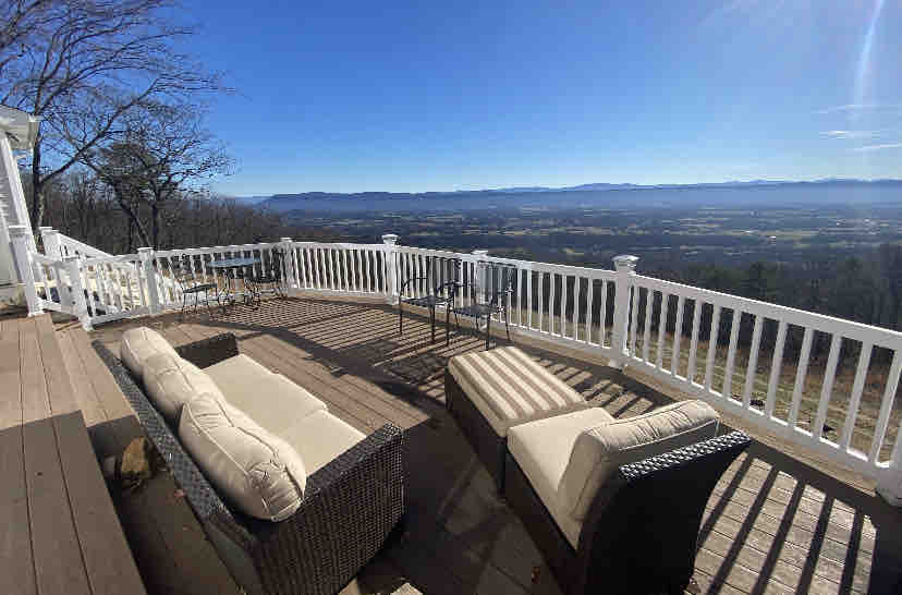 Spectacular mountaintop view of the Shenandoah Valley & three mountain ranges. 3 bedrooms with private full baths & Alaskan hand-hewn birchwood beds. Roam the private 18 acres, or wander the adjacent George Washington National Forest, step out the front door onto the North Mountain Blue Trail, or watch unrivaled sunrises and starry skies from the spacious deck. Need peace and quiet? No neighbors; just forest. Minutes from sensational valley wineries & the quaint, historic Town of Woodstock.
