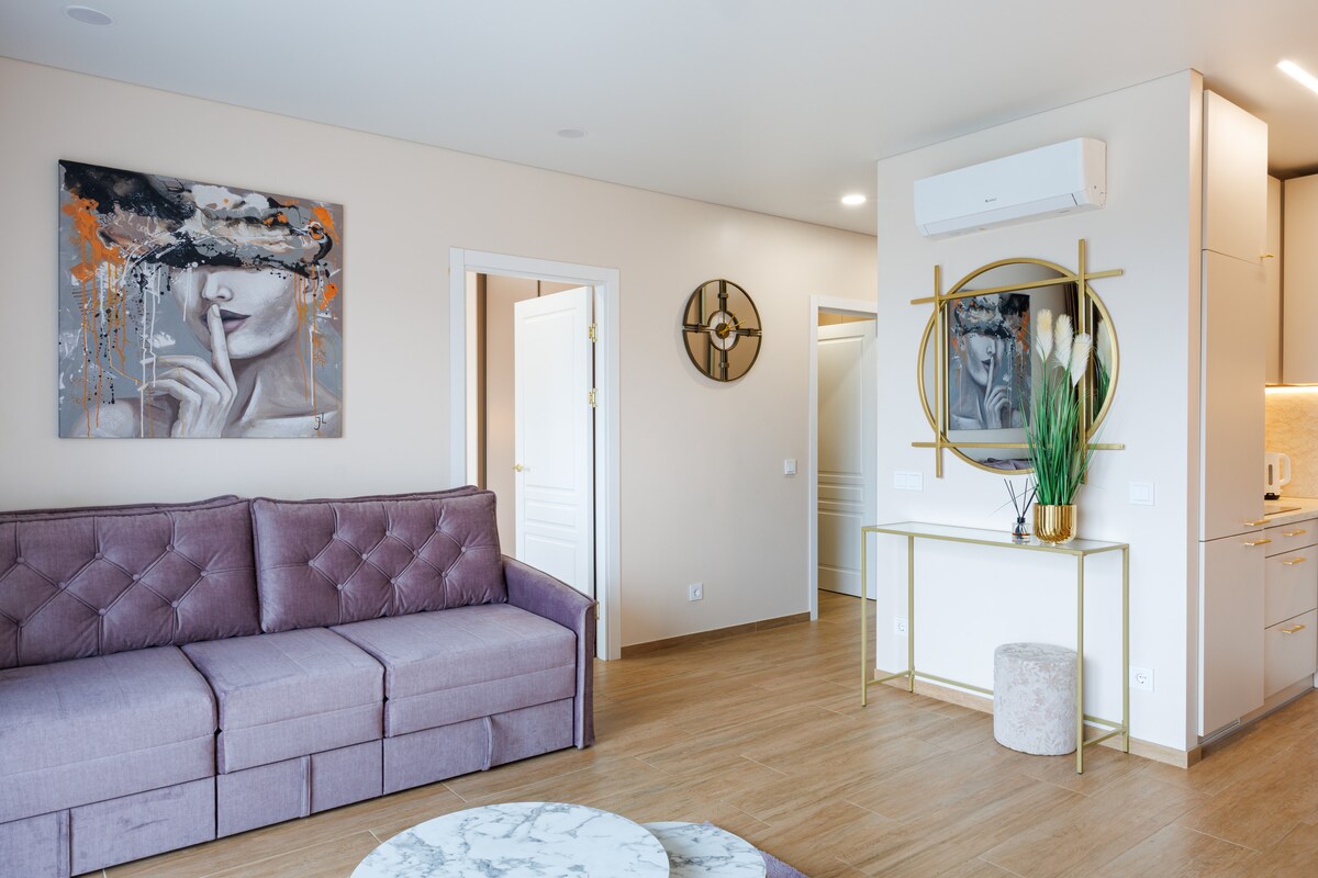 Cozy, peaceful and romantic one-room apartment with balcony in the center of Trakai next to the lake. The apartment has a well-equipped kitchen, bathroom, double sofa bed, wardrobe, and electric fireplace. Cosy, quiet and romantic flat with a balcony in central Trakai near the lake. The flat has a fully equipped kitchen, a bathroom with a bathtub and a washing machine, a double sofa bed, a wardrobe and an electric fireplace.