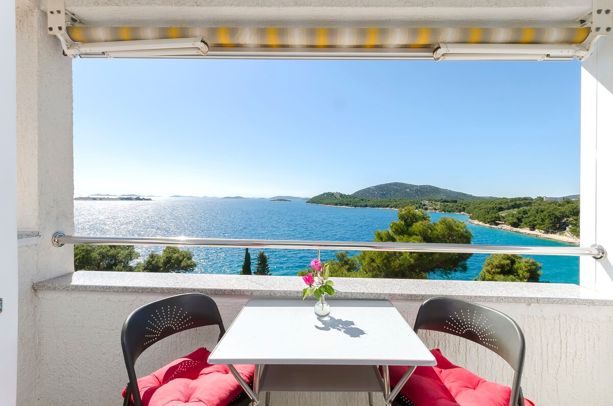 This is one of two apartments in totally equipped, fully modern, newly built stone villa. It has amazing view on old town, nautical marina, sea and view of islands (national park Kornati). It is in center of town, but away from noise, and only 50m from beach. Has 2 balconies with sitting and dinning furniture, 2 bedrooms open living rooms with great views with large glass windows, free private parking in front of the villa,air con, free fast internet