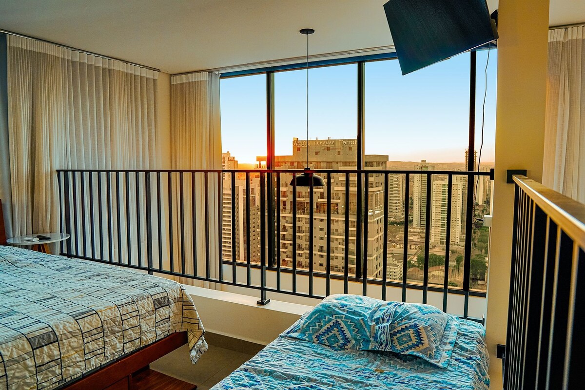 The Flat's architecture was designed by one of the most renowned professionals in Goiânia. The idea is for you to feel at home during your stay. Everything is automated; lights, curtains, TV, air-conditioning that offer comfort and refinement, just ask Alexa. Listen to music, watch more than 1,600 open and closed channels. Take a nice shower with a generous shower head. Take photos and relax on the balcony with a sensational sunset view and acrylic ceiling.