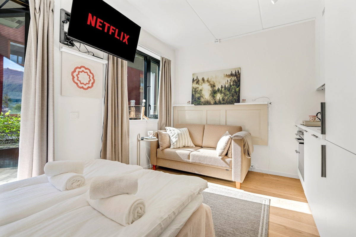 Velkommen til denne moderne og sjarmerende studio leiligheten midt i det populære og nyutviklede området Vervet i Tromsø – rett ved sjøen og med alt Tromsø har å by på rett utenfor døren🖤 Her bor du med umiddelbar nærhet til trendy restauranter, koselige kafeer, sjøbad, den populære Ishavsporten, og den ikoniske Ishavskatedralen – alt innen kort gangavstand. Vi ser frem til å ønske dere velkommen!