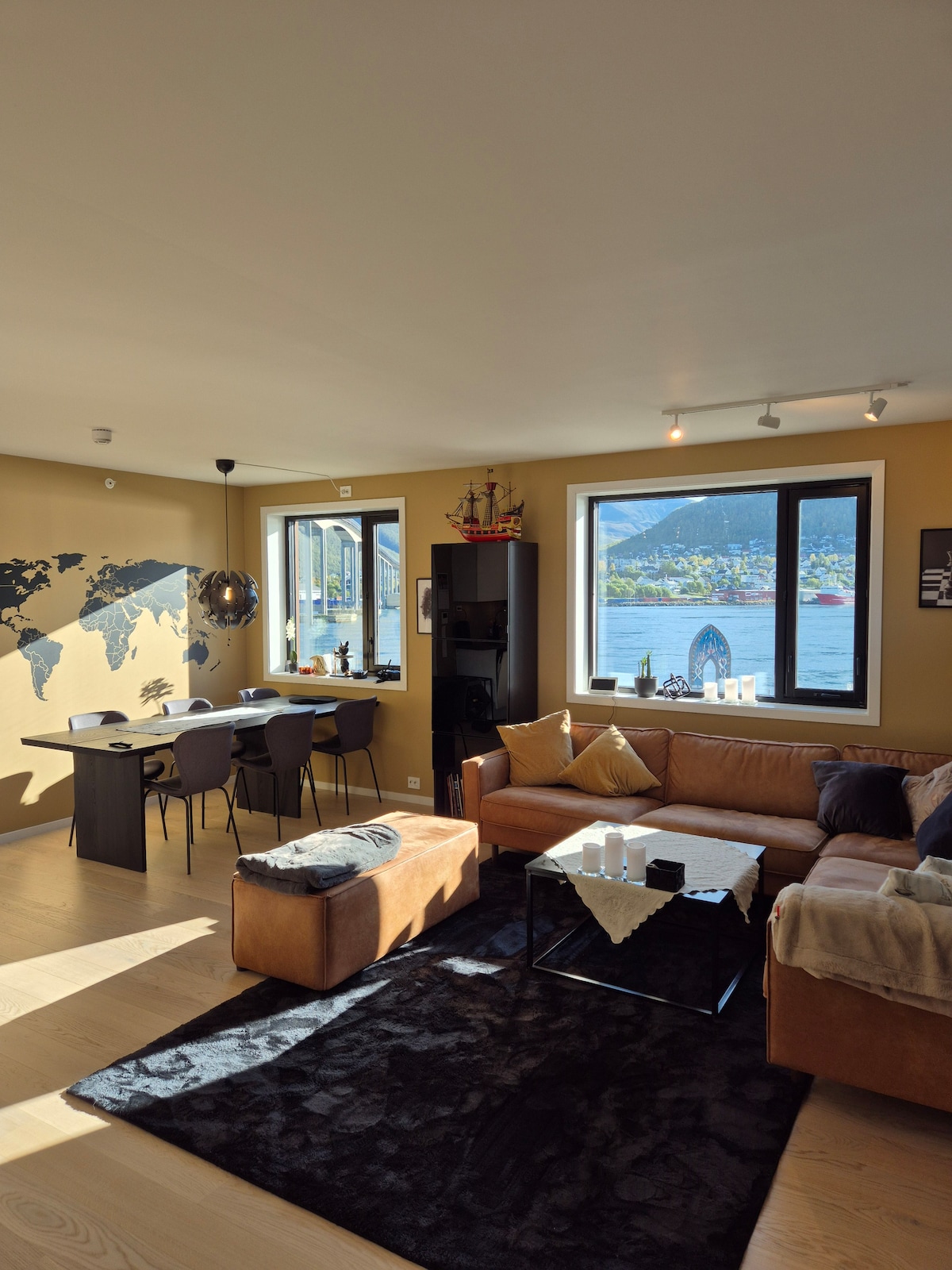 Stylish top-floor apartment by the sea in central Tromsø with an impressive view of the Arctic Cathedral, Tromsø Bridge, Cable car, midnight sun and the Northern Lights. Enjoy Hurtigruta sailing in from the sofacorner and hear waves lapping outside. The entrance is part of a glazed terrace with views to the south. The center is a 10-minute walk away. The apartment is open, inviting, and a nice & comfortable place to spend your time. Age limit to rent: minimum 25 years. NO SMOKING OF ANY KIND.