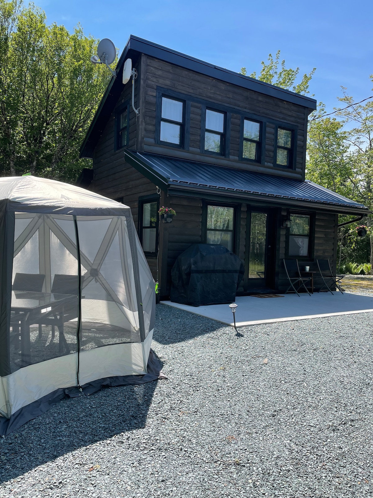 Enjoy a peaceful and relaxing getaway while staying in your very own log cabin in the woods. You will have everything you need for your stay and more! Take a deep breath-smell the ocean air- now exhale. You are completely private only surrounded by blue skies and green trees with ample parking for multi vehicles/ATV’s etc We offer free WIFI and have indoor and outdoor games for you. Don't forget about relaxing by the fire pit and enjoying all of the stars in the sky. @clam_harbour_hideaway
